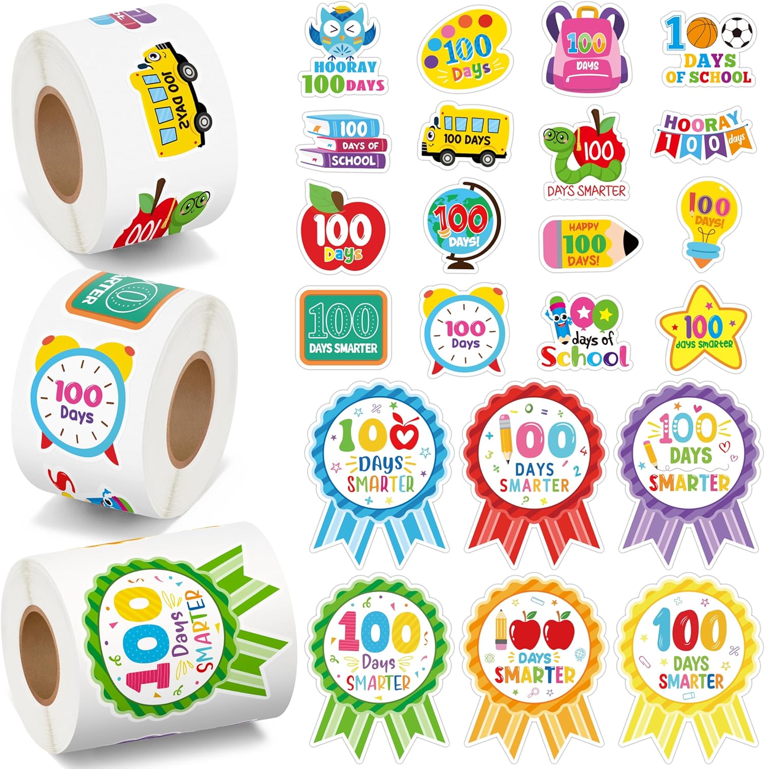 BeYumi 100 Days Smarter Sticker – 1200Pcs 100th Day of School Stickers in 3 Rolls for Kid 100 Days Smarter Badge Teacher Reward Sticker Cartoon Waterproof Vinyl Decal Party School Classroom Gift Decor,