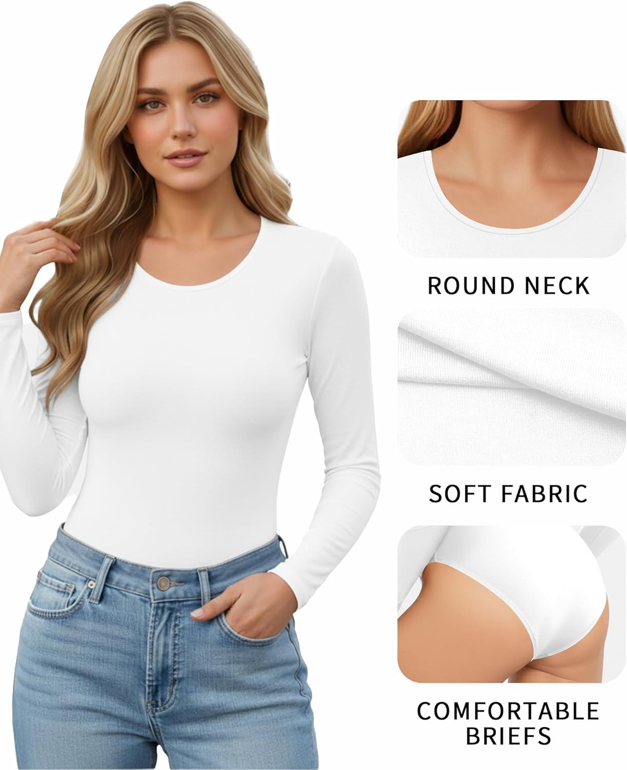 MANGOPOP Round Neck Long Sleeve Short Sleeve Bodysuits for Women Basic Body Suit Shirts Tops,