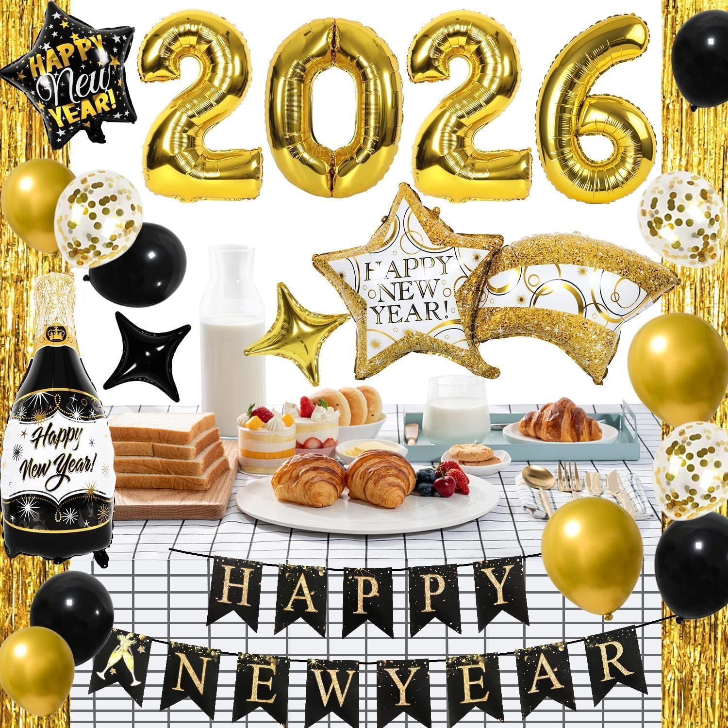 Labeol 39 PCS New Years Decorations 2026, Happy New Year Set with Large Foil Balloons, Banner, Gold Foil Curtains Black, Gold, Confetti Balloons for Party,