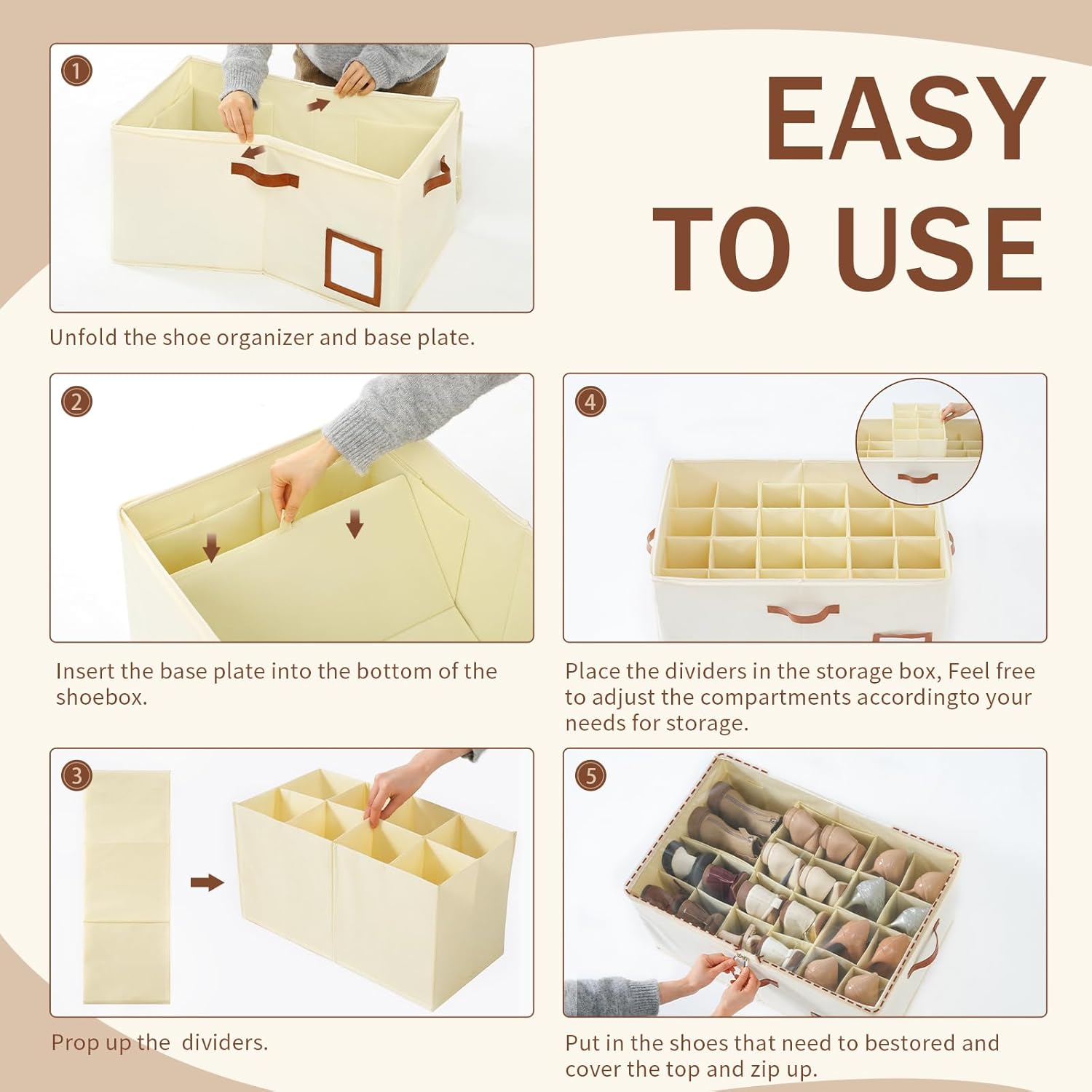 Shoe Organizer for Closet Fit 24 Pairs, Large Foldable Shoe Storage Containers Box Bin w/Adjustable Dividers and Clear Cover, Space Saving Shoe Storage Organizer Box, Beige,