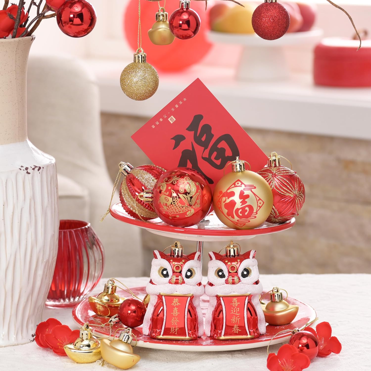 Valery Madelyn 2026 Chinese New Year Decorations for Small Christmas Tree, 30ct Shatterproof Lunar New Year Hanging Ornaments Good Luck Blessing Gifts Lion Dance Gold Ingot Chinese Knots and Coins,